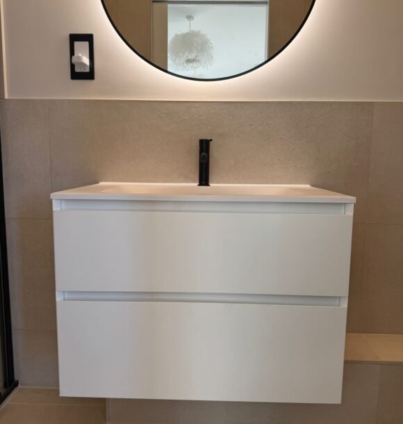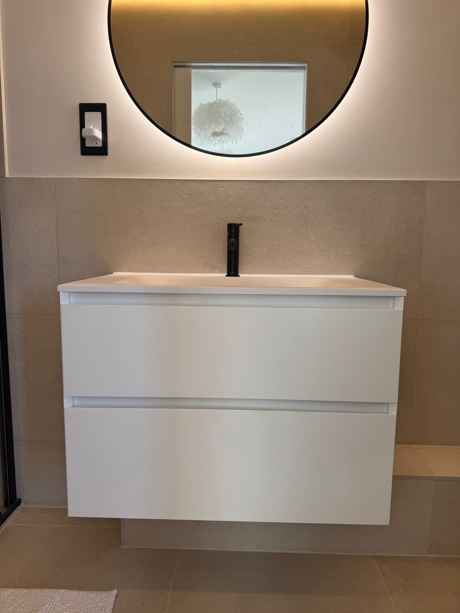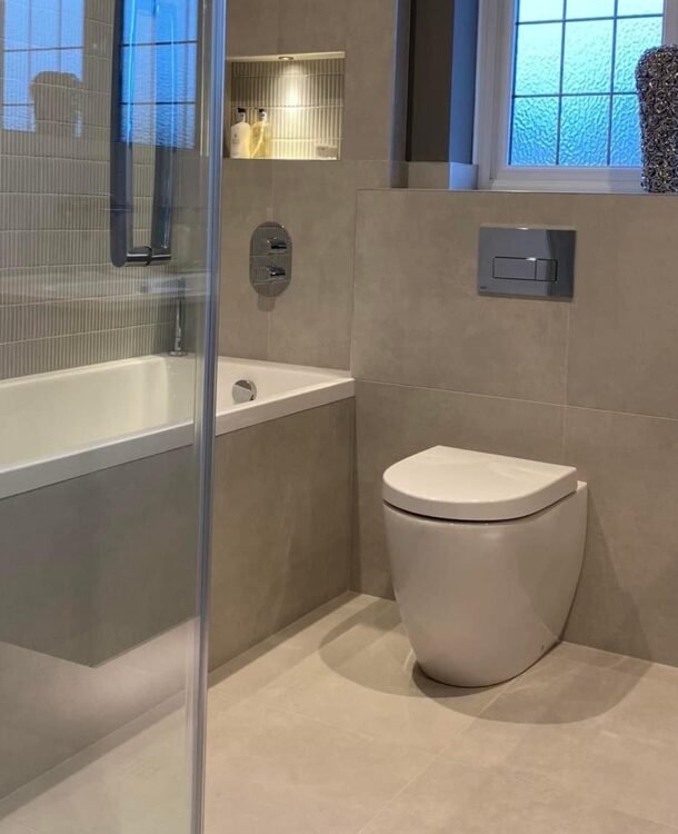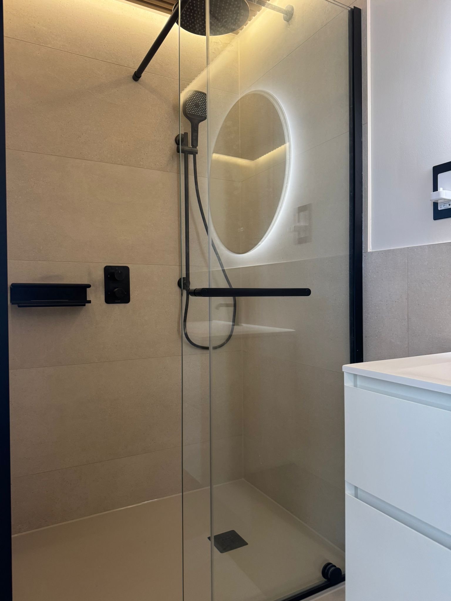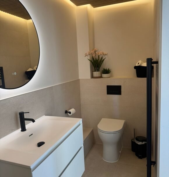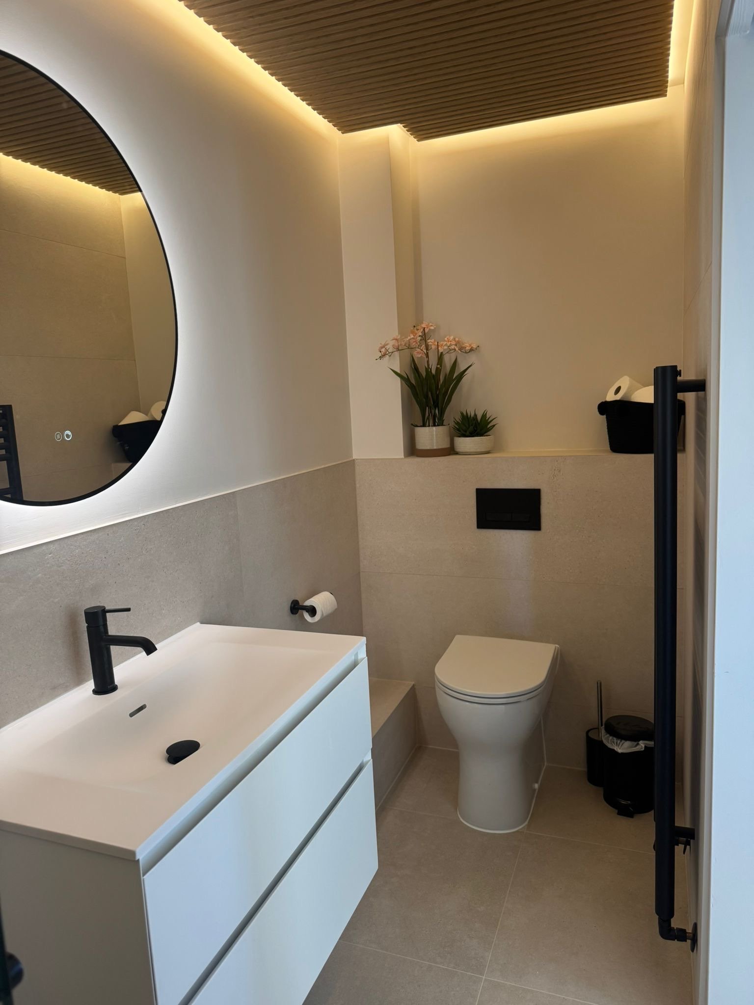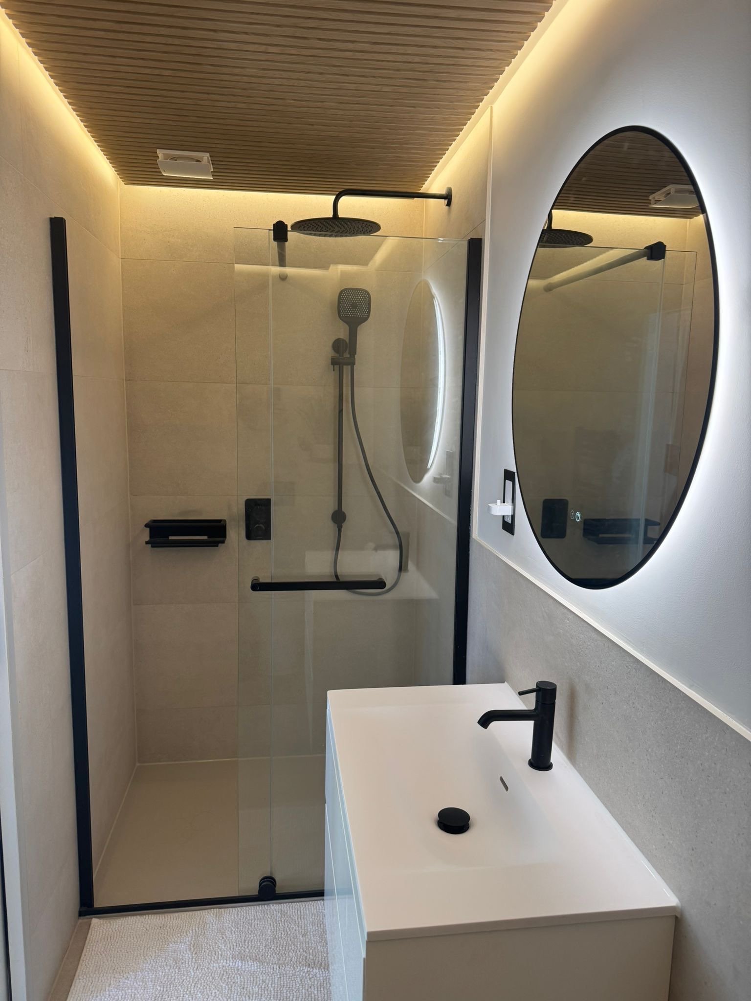 3200x1200mm with a pocket door for access. 1200x600mm tiles on the walls. 600x600mm tiles on the floor. Underfloor heating for those extra cold days and nights. Panelled ceiling with hidden Led lighting really sets the ambience and adds a different dimension. Soft Taupe slate effect shower tray. Matt black taps, showering equipment and radiator. Matt white basin & basin storage unit. Matt black illuminated mirror for another way of achieving a relaxing yet functional room.