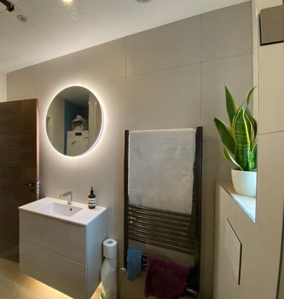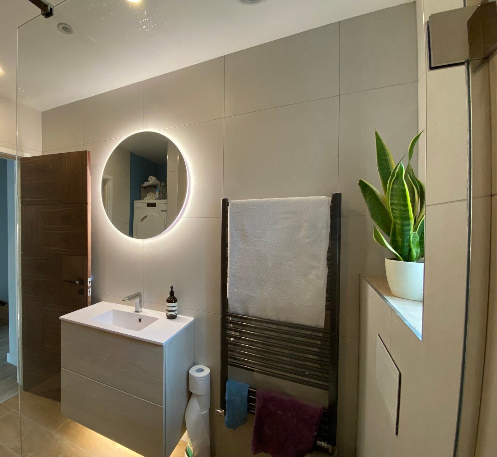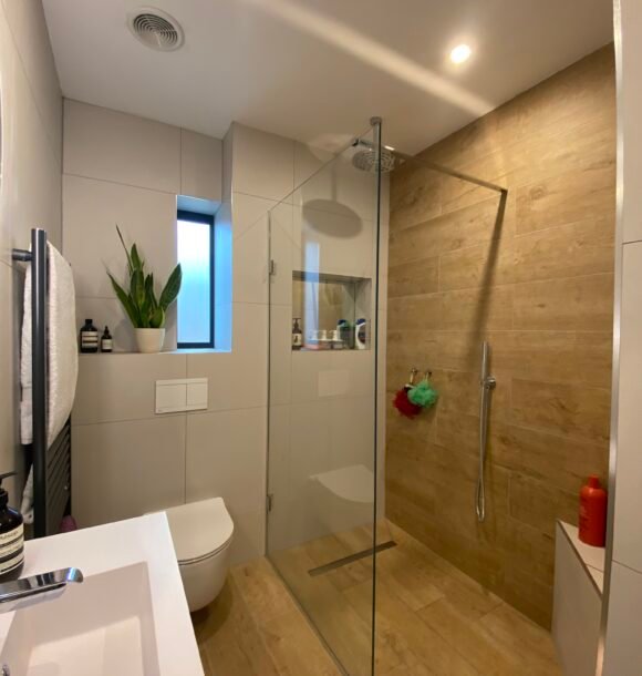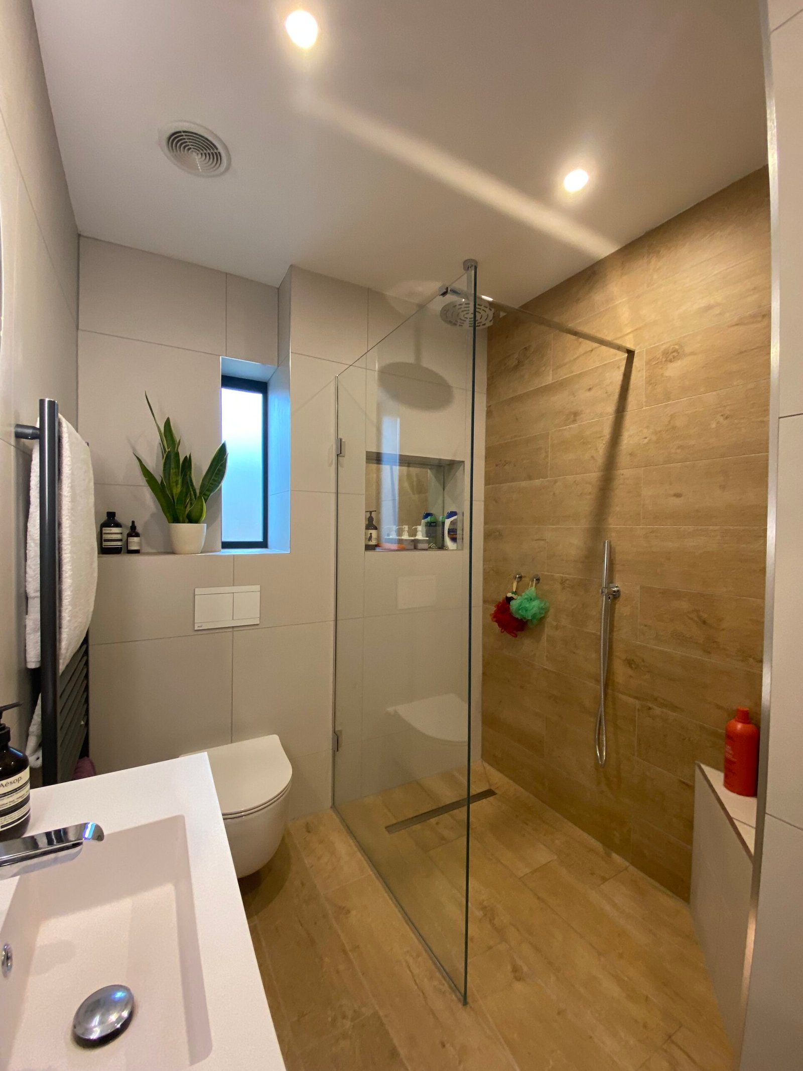 Our brief was to bring the original tired 1960’s bathroom into the most minimal, stylish, and functional Wet Room. We reduced the original aperture and installed a contemporary window that added style and functionality. Along with this, we created an area for the washing machine and tumble dryer, that not only met electrical requirements, it has made it so easy for the family to stay on top of their laundry.