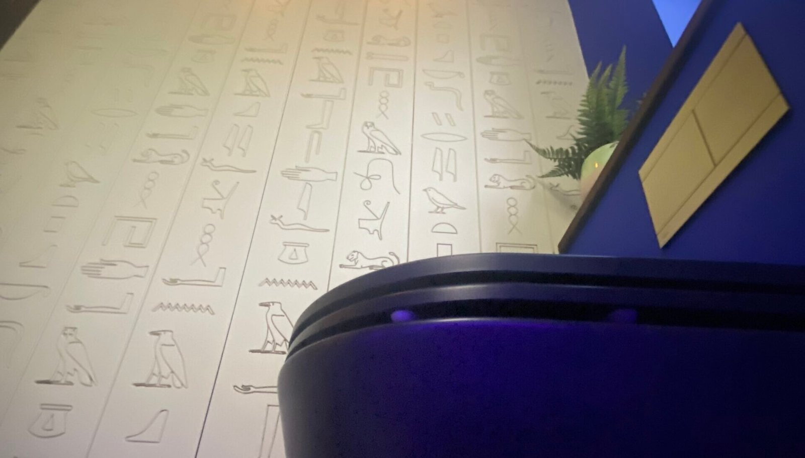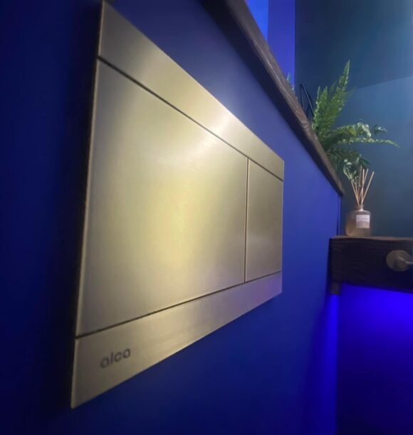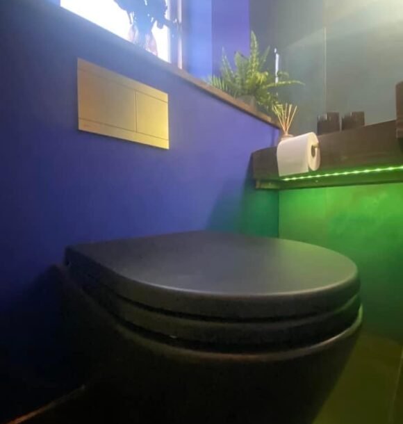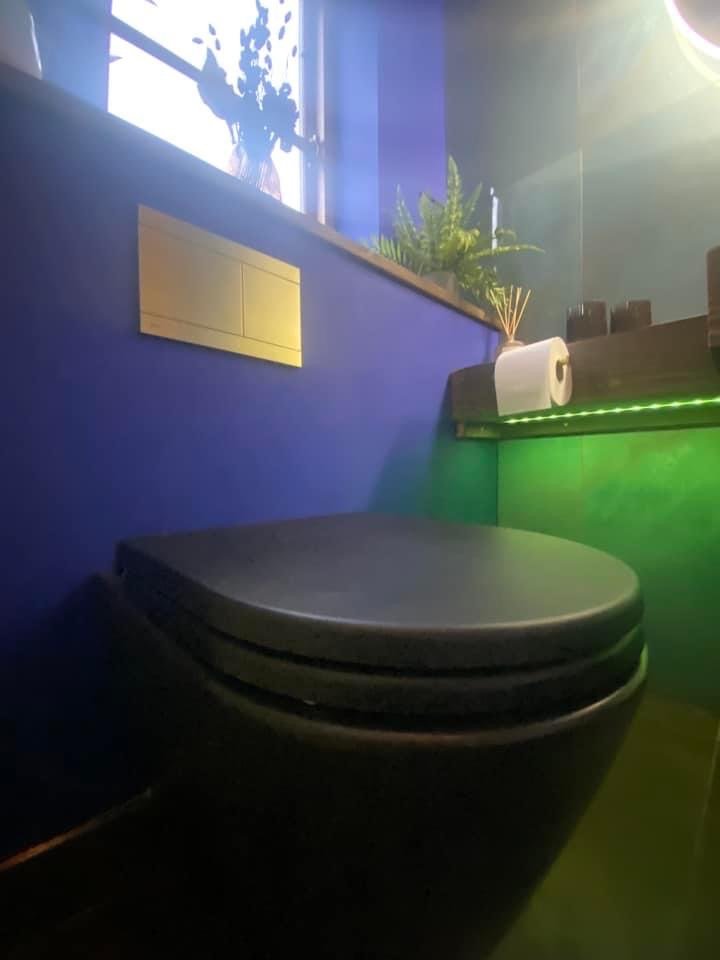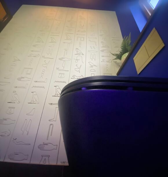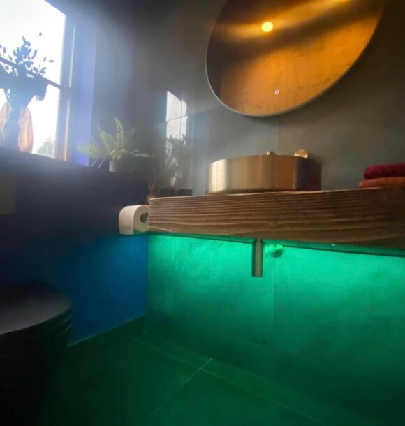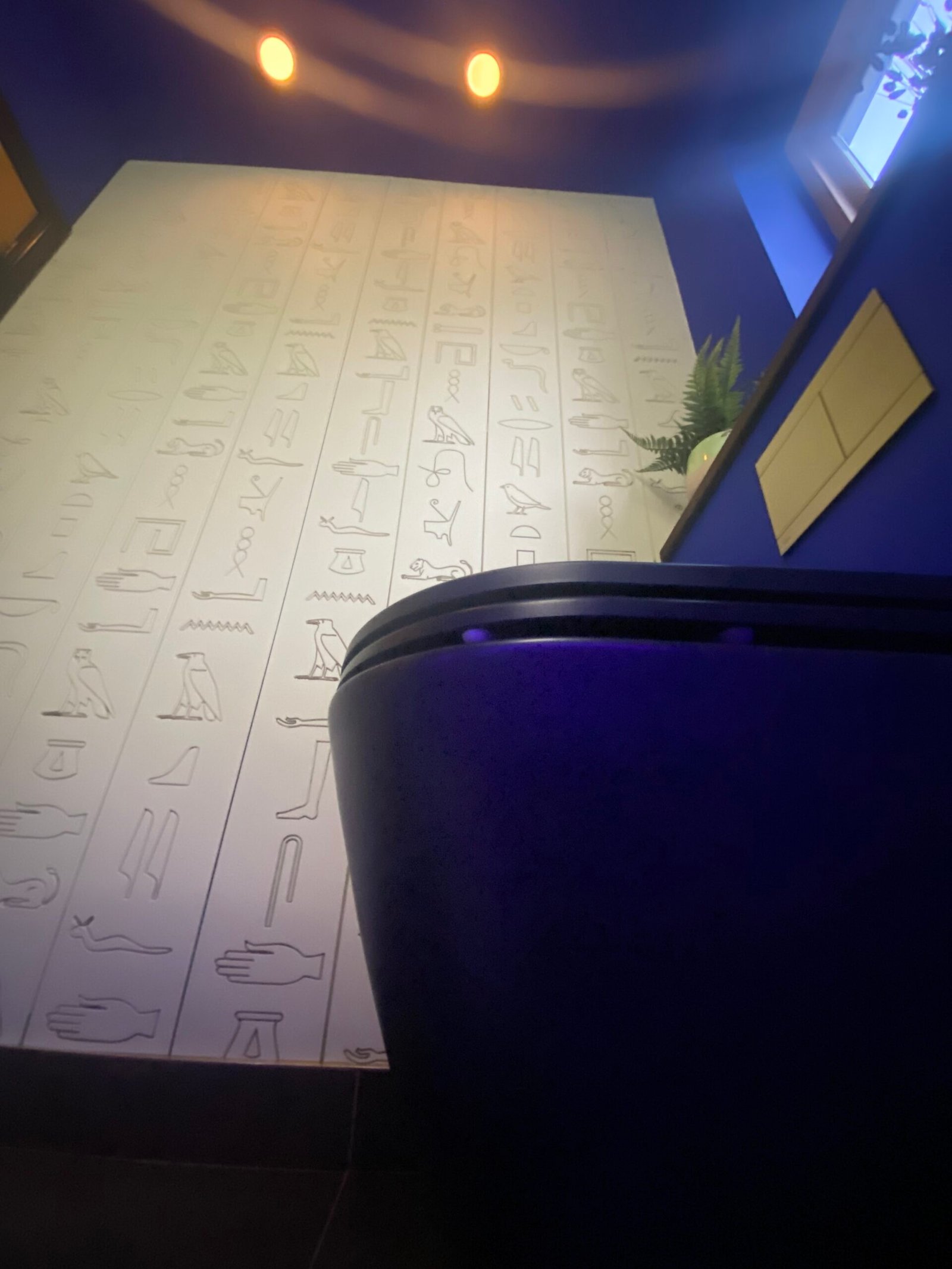 Hieroglyphics have been CNC engraved into custom made wall panels. Painted thereafter with “stone dust.” Torched beam supporting the beautifully crafted brushed brass washbasin. Matt black wall hung w.c, coupled with brushed brass dual flush plate. Dimmable and colour changing lighting finishes off the porcelain tiles and Egyptian cotton wall paint. A remarkable party cloakroom for a very clever and committed daughter to enjoy for many years ahead.