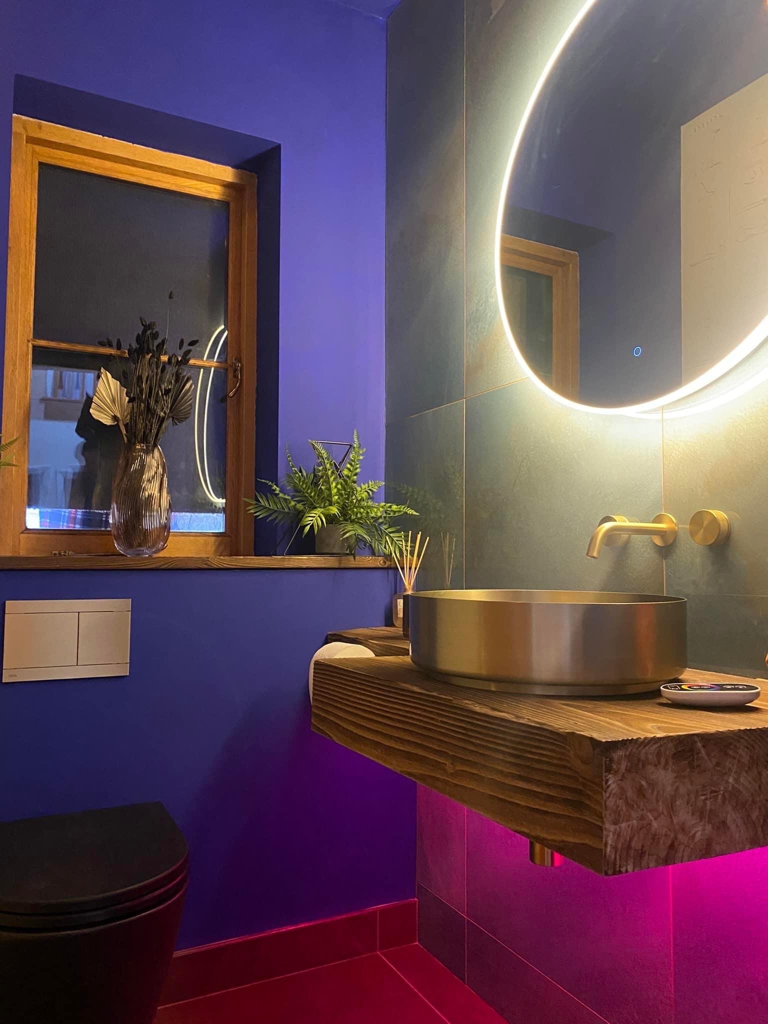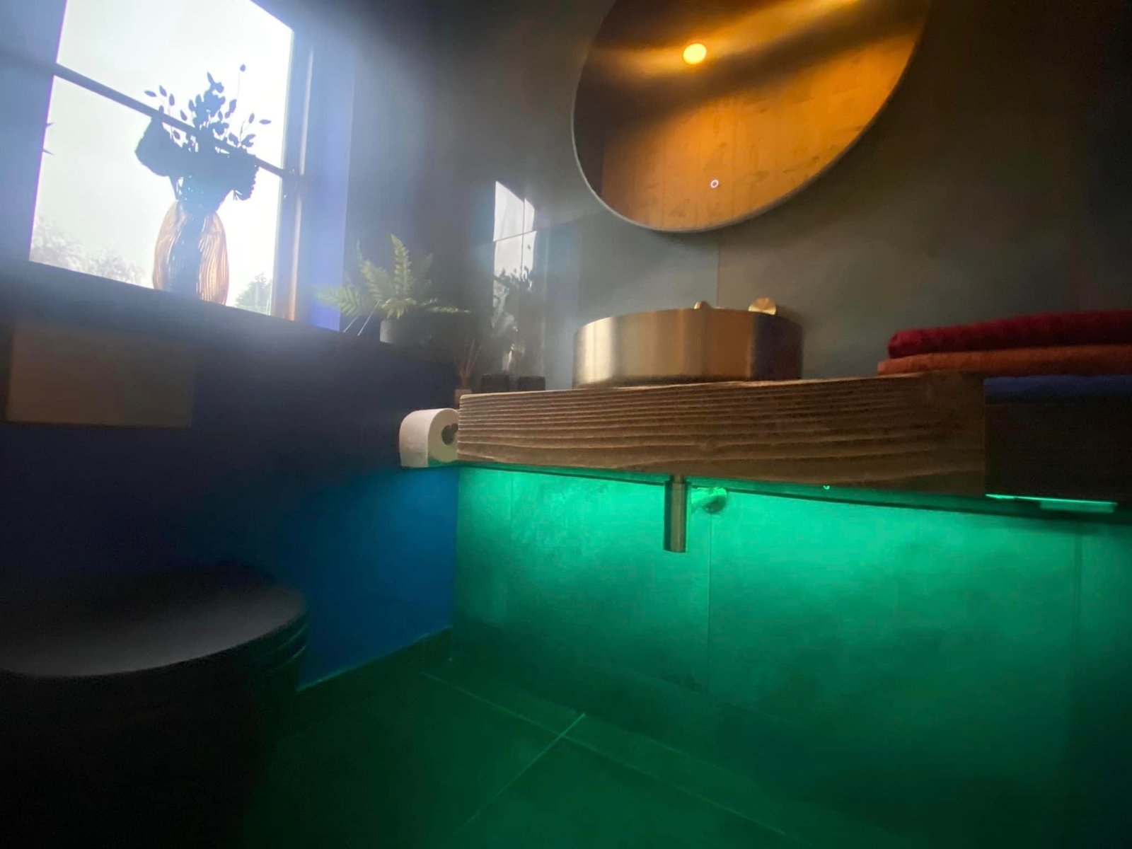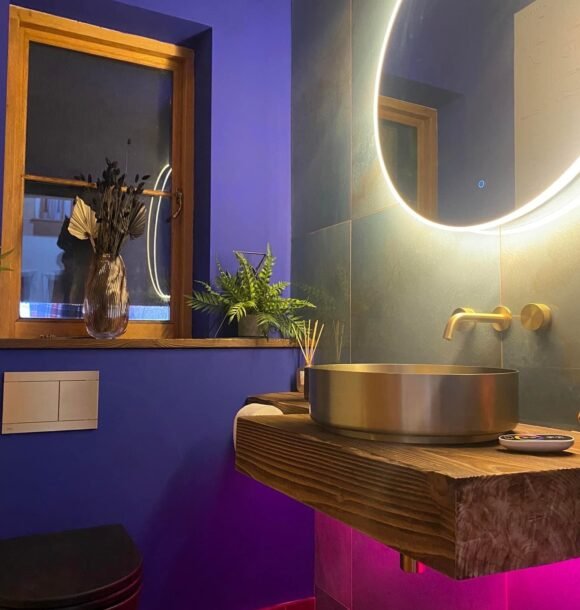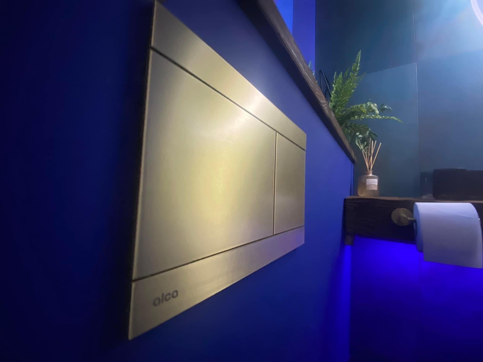Hieroglyphics have been CNC engraved into custom made wall panels. Painted thereafter with “stone dust.” Torched beam supporting the beautifully crafted brushed brass washbasin. Matt black wall hung w.c, coupled with brushed brass dual flush plate. Dimmable and colour changing lighting finishes off the porcelain tiles and Egyptian cotton wall paint. A remarkable party cloakroom for a very clever and committed daughter to enjoy for many years ahead.
