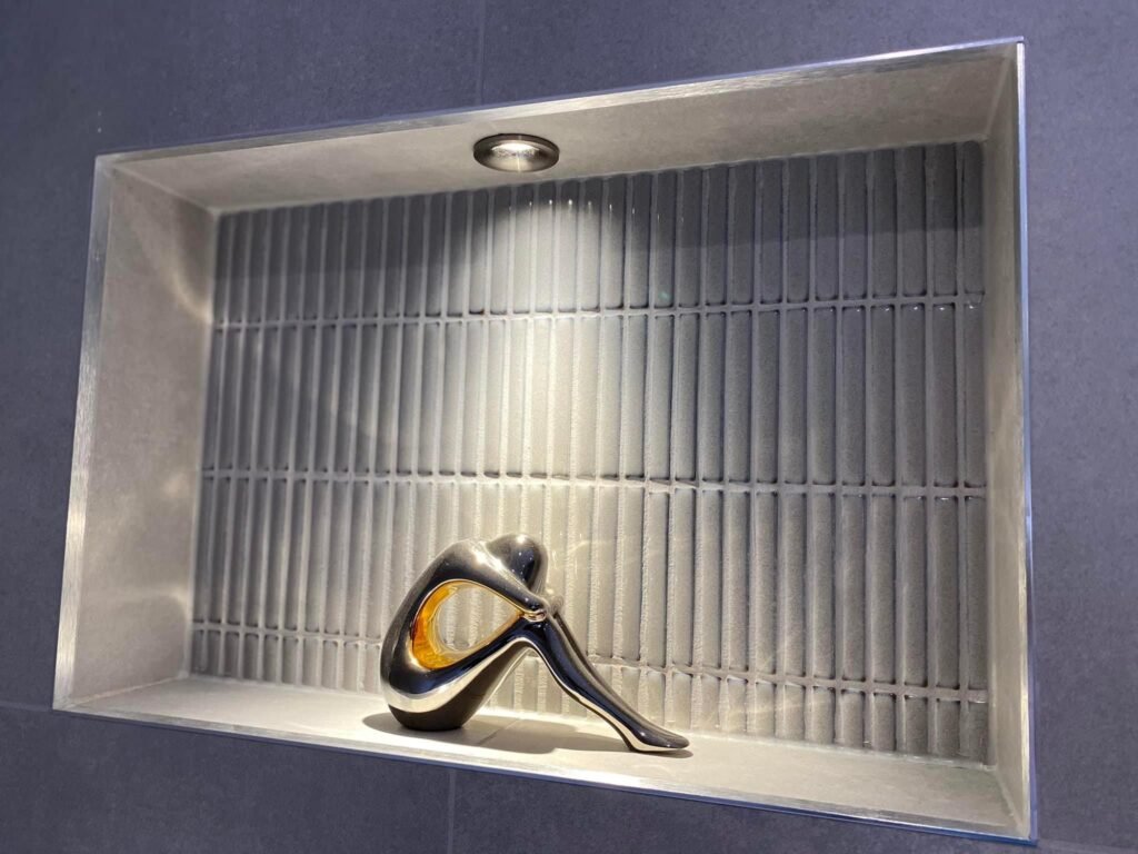 “Timeless, monochrome, subtle lighting, accents of mosaics, hotel chic”