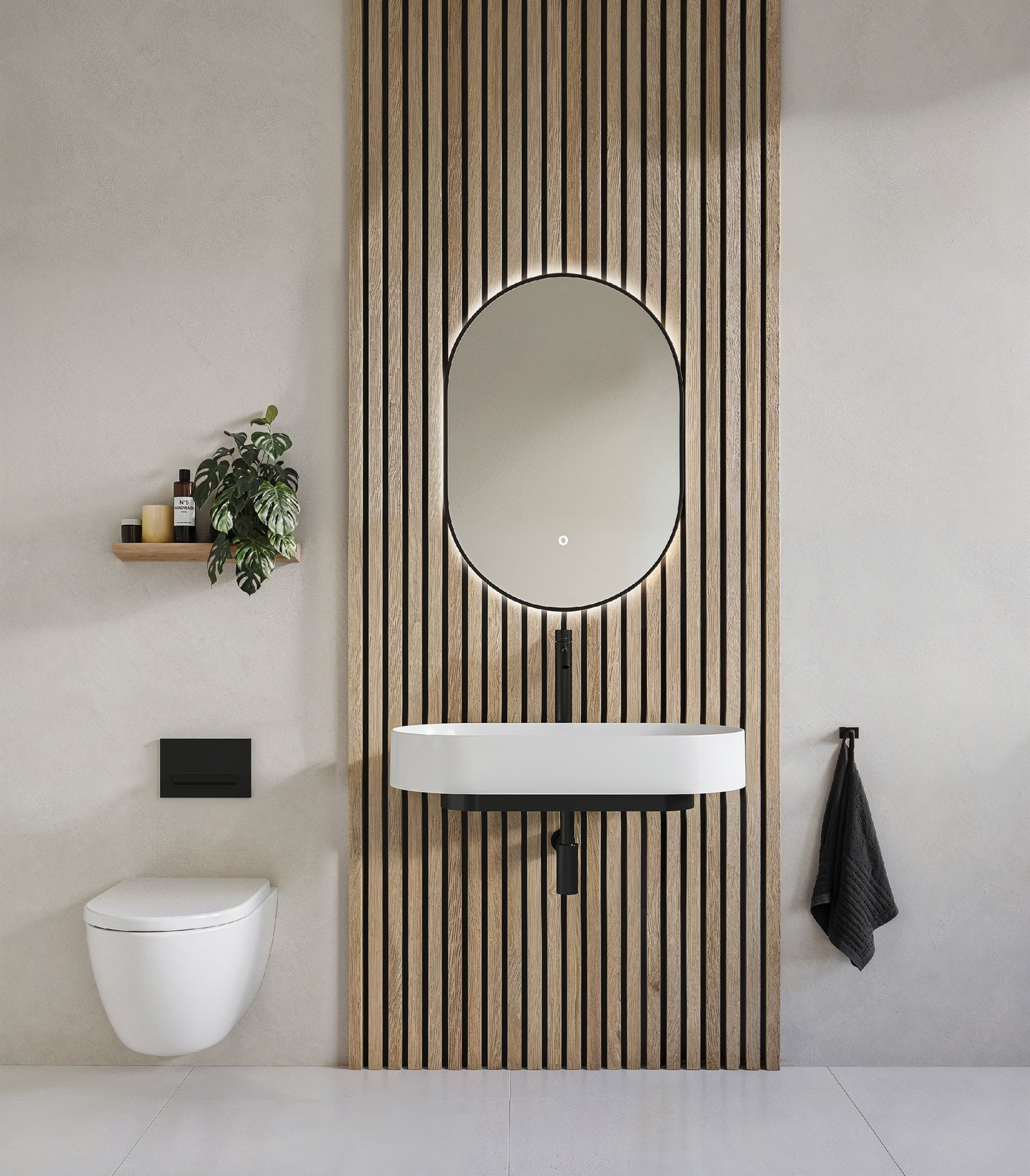 The Matt Black design in our Terzo mirror collection offers a statement look which pairs beautifully with other Matt Black details in the bathroom. The circular and capsule designs create softness in any space and expertly balance any straighter edges from nearby showers or basin units, with back-lit LED lights creating an inviting glow against the wall behind.
