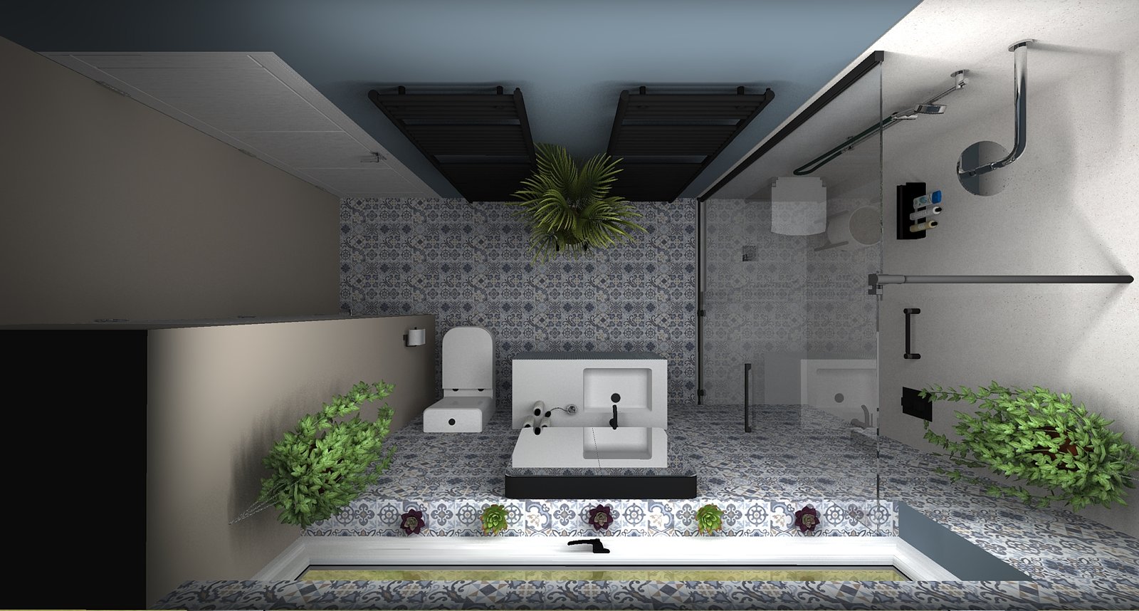 “Timeless, monochrome, subtle lighting, accents of mosaics, hotel chic”